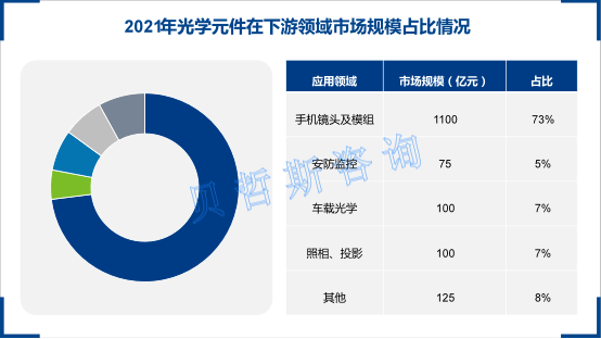 智能手机依旧是光学元器件最重要的市场,占比70%以上。2021年,手机用光学元器件产业规模约1100亿元人民币,同比基本持平。安防监控市场正经历从标清、定焦到高清、变焦、智能、夜视的换挡升级期,且行业对安防监控的定位正在从公共安全向社会服务转变,新的市场需求不断涌现,2021年安防监控镜头的产销量继续保持增长,对应的产业规模约为75亿元,同比增长20%以上。电气化和智能化驱动下汽车行业维持高关注和高增长,推动车载摄像头的市场规模持续增长,2021年车载摄像头及模组的市场规模约为100亿元,同比增长20%以上。照相投影是光学元器件的传统应用领域,在智能化潮流带领下,单反相机、运动摄影、智能投影等产品相继集成智能联网等功能吸引消费者,带动销量增长,对应的光学元器件规模约为100亿元,同比略有增长。