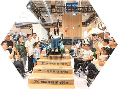 9月6日,在浙江宁波举办的第十五届中国智慧城市与智能经济博览会上,数智场景馆里“科技助残”智能康养体验展区吸引了不少观众驻足。图为残障人士体验全地形智能爬楼机器人。 贺元凯摄(人民图片)